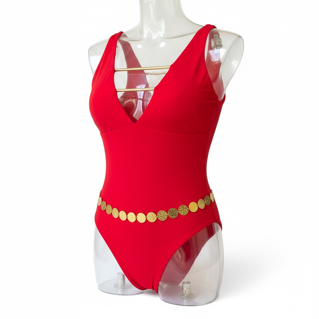 Composée de pastilles dorées martelées sublime la taille et rehausse les maillots comme les robes d’été.
